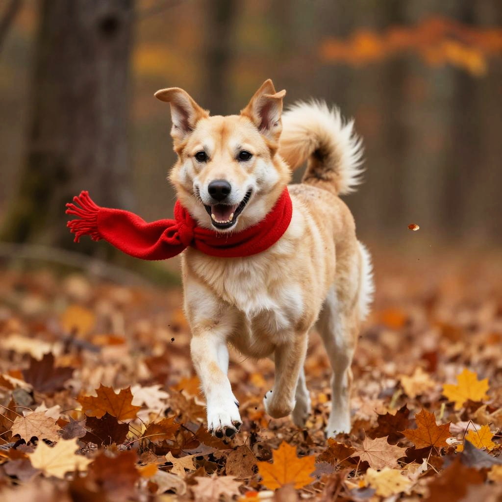 Dog with red scarf running through autumn leaves in a forest, dynamic motion, vibrant orange and red colors, realistic lighting, high detail