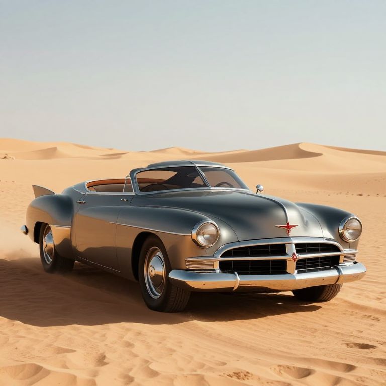 Byzantine Icon retro futuristic concept car in the desert, circa 1945, lots of chrome trim, octane render,