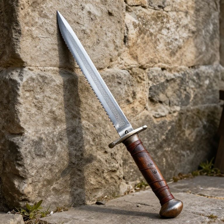 Photograph of a sharp, serrated, silver dagger with a dark wooden handle leaning against a weathered stone wall on a stone pathway.