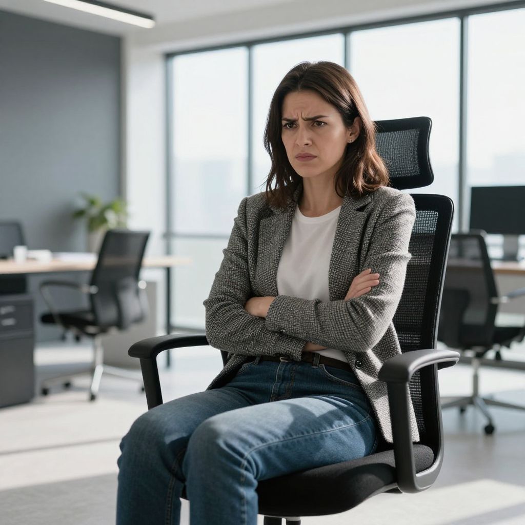 Photograph of a middle-aged woman with light olive skin and dark brown, shoulder-length hair, sitting in a black mesh office chair with arms crossed, displaying a stern expression. She wears a gray, textured blazer over a white shirt and blue jeans. The background shows a modern, brightly lit office with large windows, gray walls, and black office chairs. A desk with a computer and a potted plant is visible in the blurred background. The overall setting is professional and contemporary.