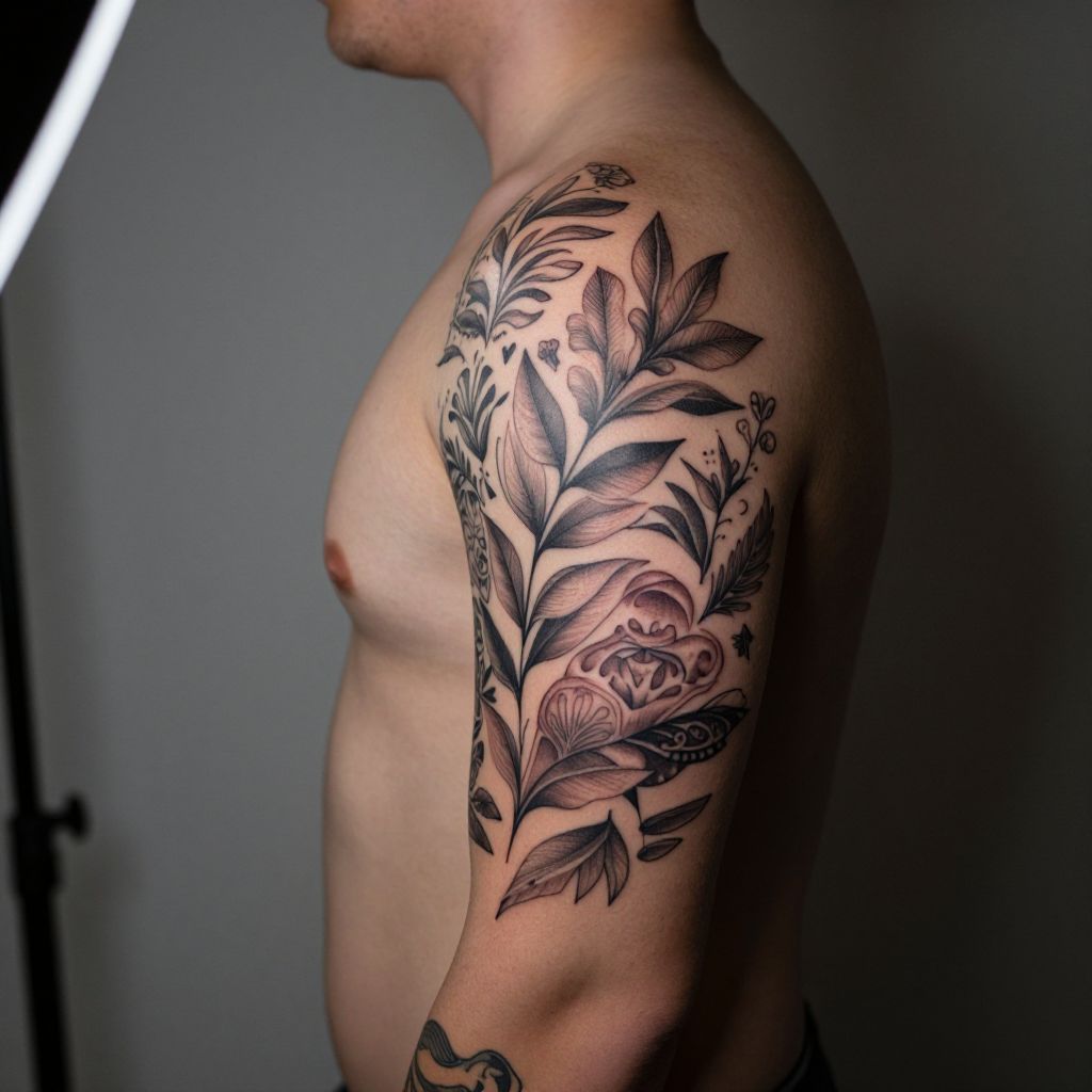A close-up realistic photograph of a diverse young adult with smooth, natural skin showing a detailed full sleeve tattoo on their left arm, featuring intricate ink patterns of nature-inspired symbols like leaves and birds, set against a soft, dimly lit studio background with a single overhead light highlighting the tattoo's depth and texture.