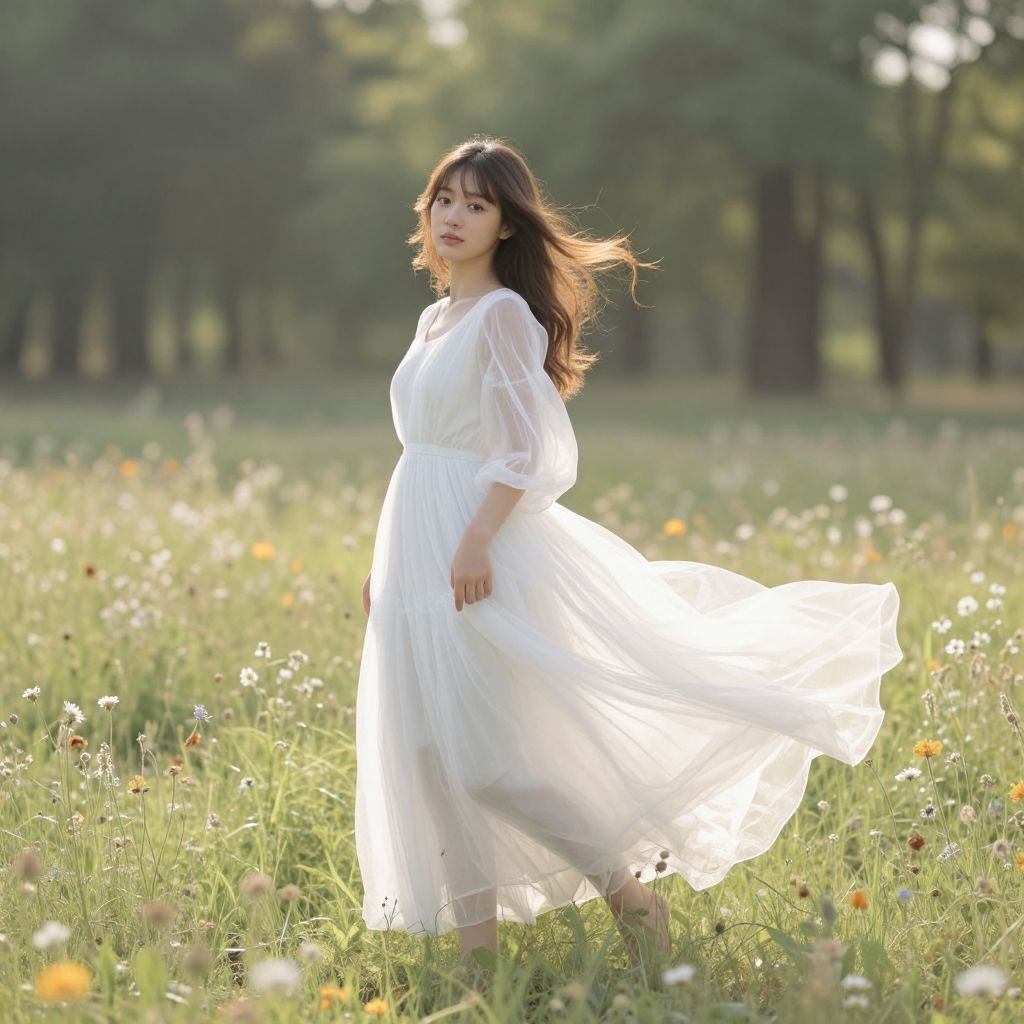 Photograph of an Asian woman in a flowing white dress, standing in a sunlit meadow with wildflowers, her hair blowing gently.