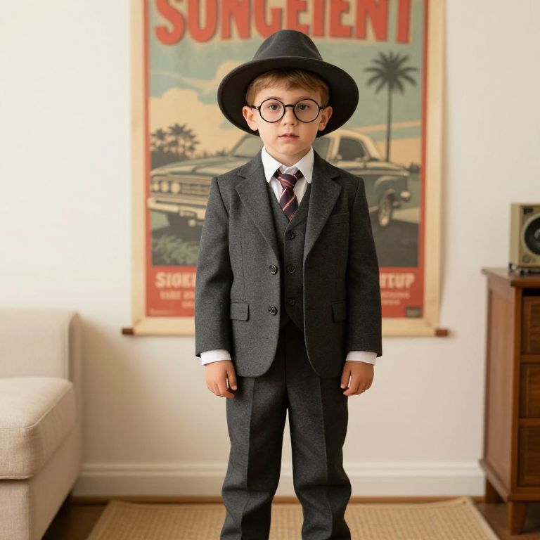 A young boy wearing a vintage-style old man's suit, complete with a hat and glasses, standing in front of a retro-themed poster in a living room.