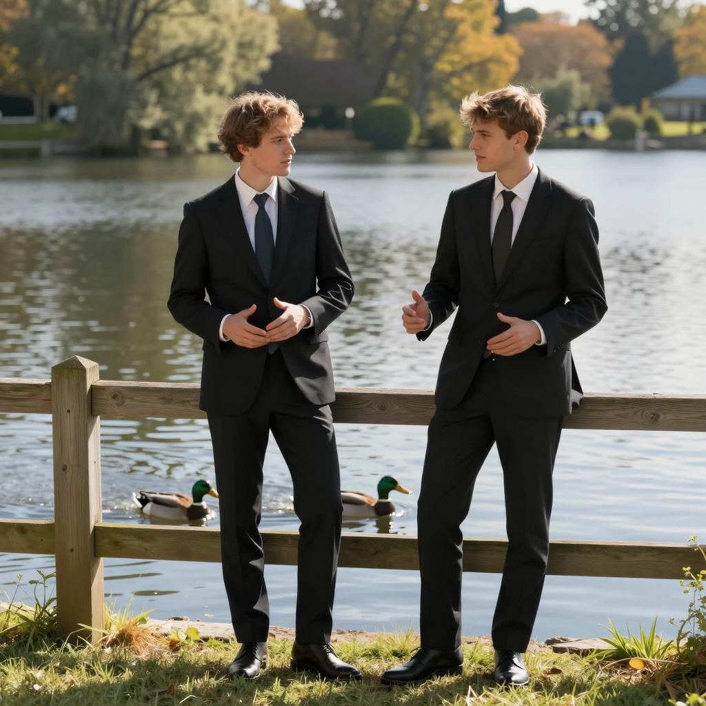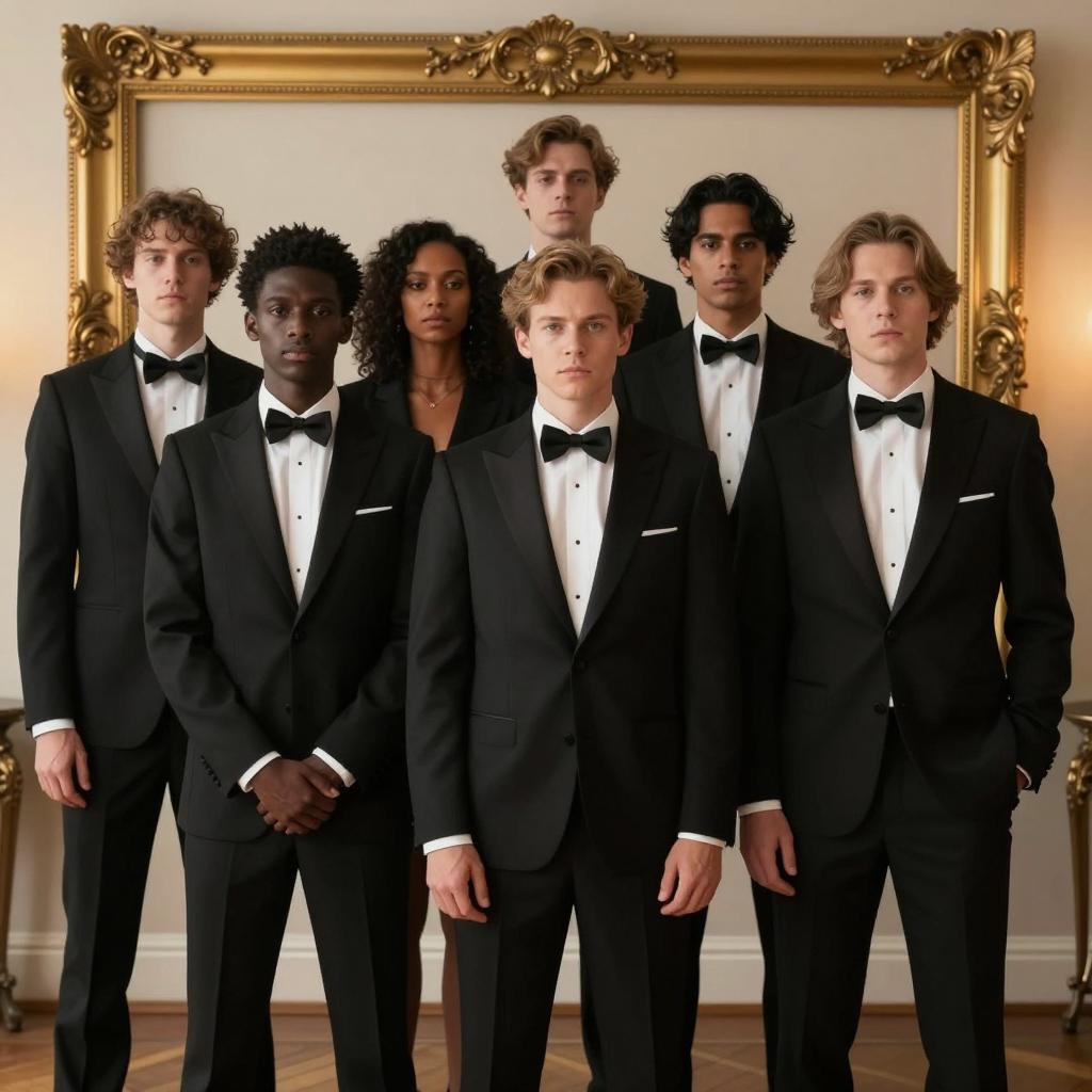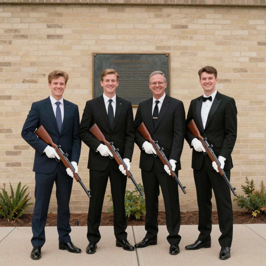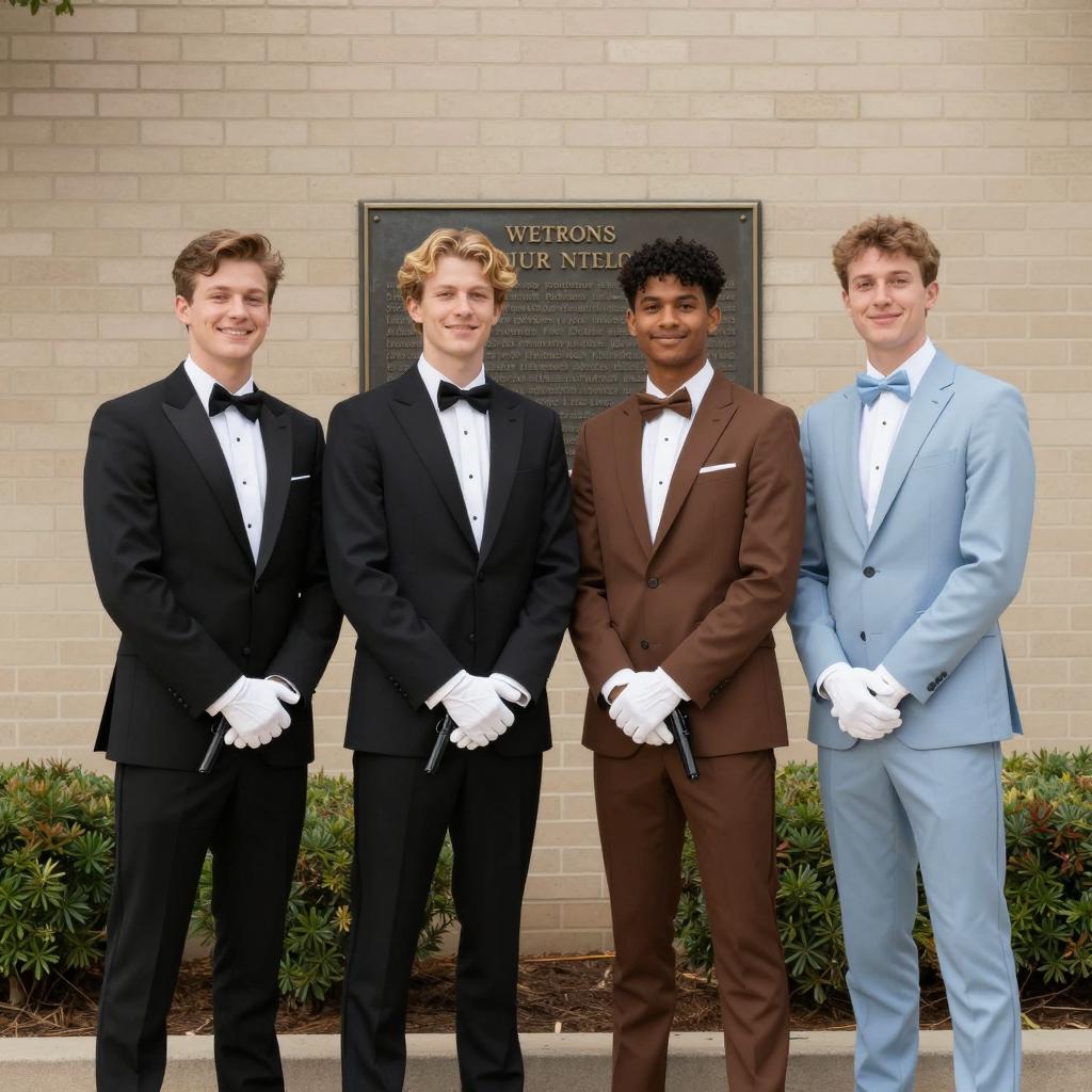 Photograph of four men standing in front of a beige brick wall. They wear suits, white gloves, and hold guns. Three men in the center wear black and brown tuxedos, one in a light blue suit on the right. All smiling. Background has a metal plaque. Bushes at the bottom.