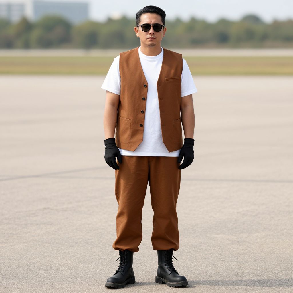 Man with glasses, brown outfit, and black gloves is standing on a tarmac. The man is wearing a white t-shirt and brown pants with a white shirt underneath. He has a pair of black boots on his feet and is wearing sunglasses on his eyes.