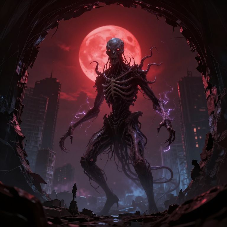 Digital artwork depicting a terrifying, skeletal monster with twisted, tentacle-like limbs and glowing purple electricity in its hands, standing in a dark, ruined urban environment. The monster's skull has empty eye sockets, and its ribcage is prominently visible. A large, red full moon dominates the night sky in the background, casting an ominous glow over the scene. Silhouetted buildings loom in the distance, and a small, lone figure stands in the foreground, appearing tiny in comparison to the monstrous creature. The image is highly dramatic and dark, with a strong contrast between the red moon and the black, shadowy figure.