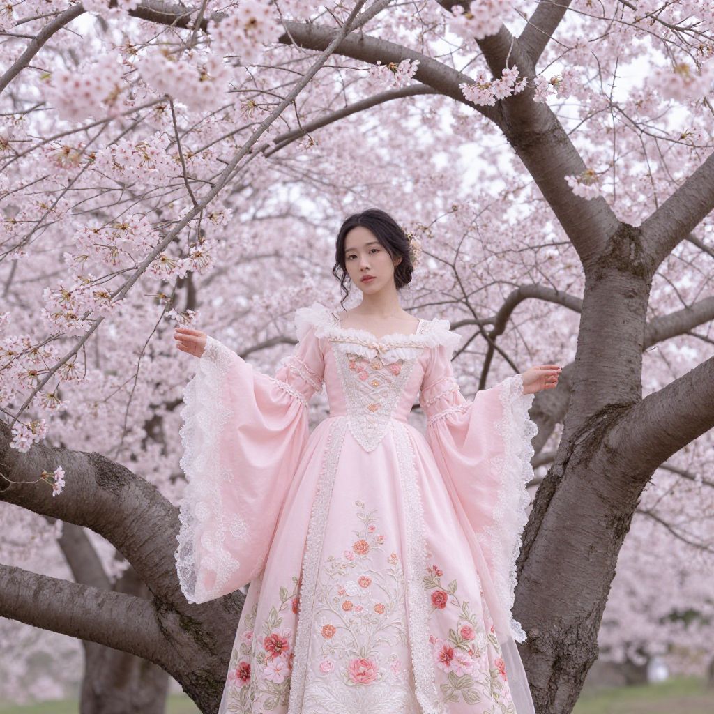 Photograph of an East Asian woman with fair skin and black hair styled in a loose updo, standing amidst a cherry blossom tree. She wears a long, pink, Victorian-style dress with wide, lace-trimmed sleeves and intricate floral embroidery. The background is filled with blooming cherry blossoms in soft pink, creating a dreamy, ethereal atmosphere. The dark brown tree branches frame her figure, adding depth to the image. Her expression is serene, with slightly parted lips, and she extends her arms outward, embracing the blossoms around her. The overall composition evokes a sense of springtime beauty and tranquility.