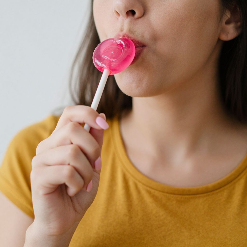 Photograph of a woman with light skin and brown hair, wearing a yellow shirt, sucking a pink, swirled lollipop with pink nails.