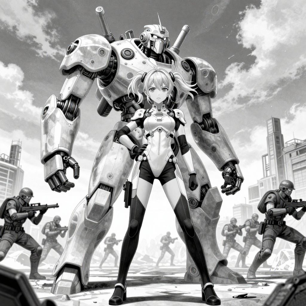 In this monochromatic manga-style illustration, a determined young woman with blonde hair, styled in twin tails, stands confidently in the foreground. She is dressed in a form-fitting, futuristic outfit that accentuates her athletic build. To her left, a massive, humanoid robot towers over the scene, its intricate mechanical components and joints clearly visible. The robot's design is sleek and imposing, with a large, rounded head and a robust, cylindrical body. In the background, a group of soldiers, clad in armor and carrying weapons, are engaged in a battle, their forms slightly blurred, suggesting movement and chaos. The horizon is dominated by a large, industrial structure, its details obscured by the distance. The sky above is filled with clouds, adding to the dramatic atmosphere of the scene. The overall composition is dynamic, with the woman and the robot positioned centrally, drawing the viewer's eye to the intense confrontation unfolding before them.