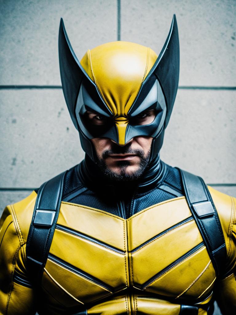 Muscular man wearing a detailed Wolverine superhero costume with yellow chest armor, blue suit, black gloves with metal claws, and signature mask. Posing in front of a neutral concrete wall, showcasing strength and intensity. Editorial portrait style.