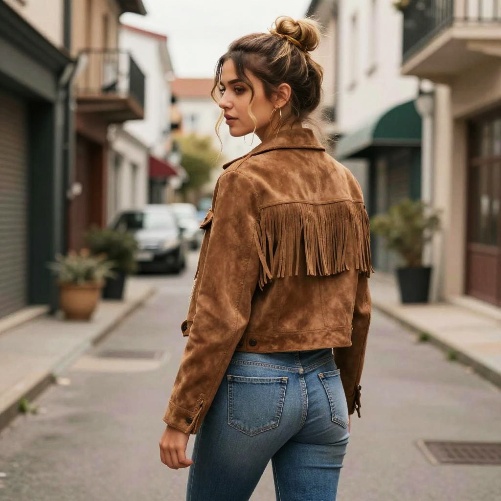 Boho Half-Updo hairstyle on earthy toned woman, wearing woven fringe shawl with linen palazzo pants, in rocky mountain trail, captured in fashion editorial style with overcast natural light.