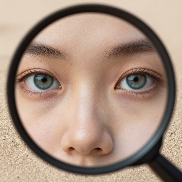 Craft a photorealistic portrait capturing intricate facial details from an unconventional viewpoint akin to viewing through a magnifying glass. Emphasize mesmerizing eyes with distinct iris patterns and visible eyelashes, skin displaying natural texture, subtle flaws, and varying tones. Integrate environmental elements like fabric threads, sand grains, or light particles for an immersive connection between the subject and their surroundings. Aim to evoke introspection and awe as viewers are drawn into this captivating close-up world.