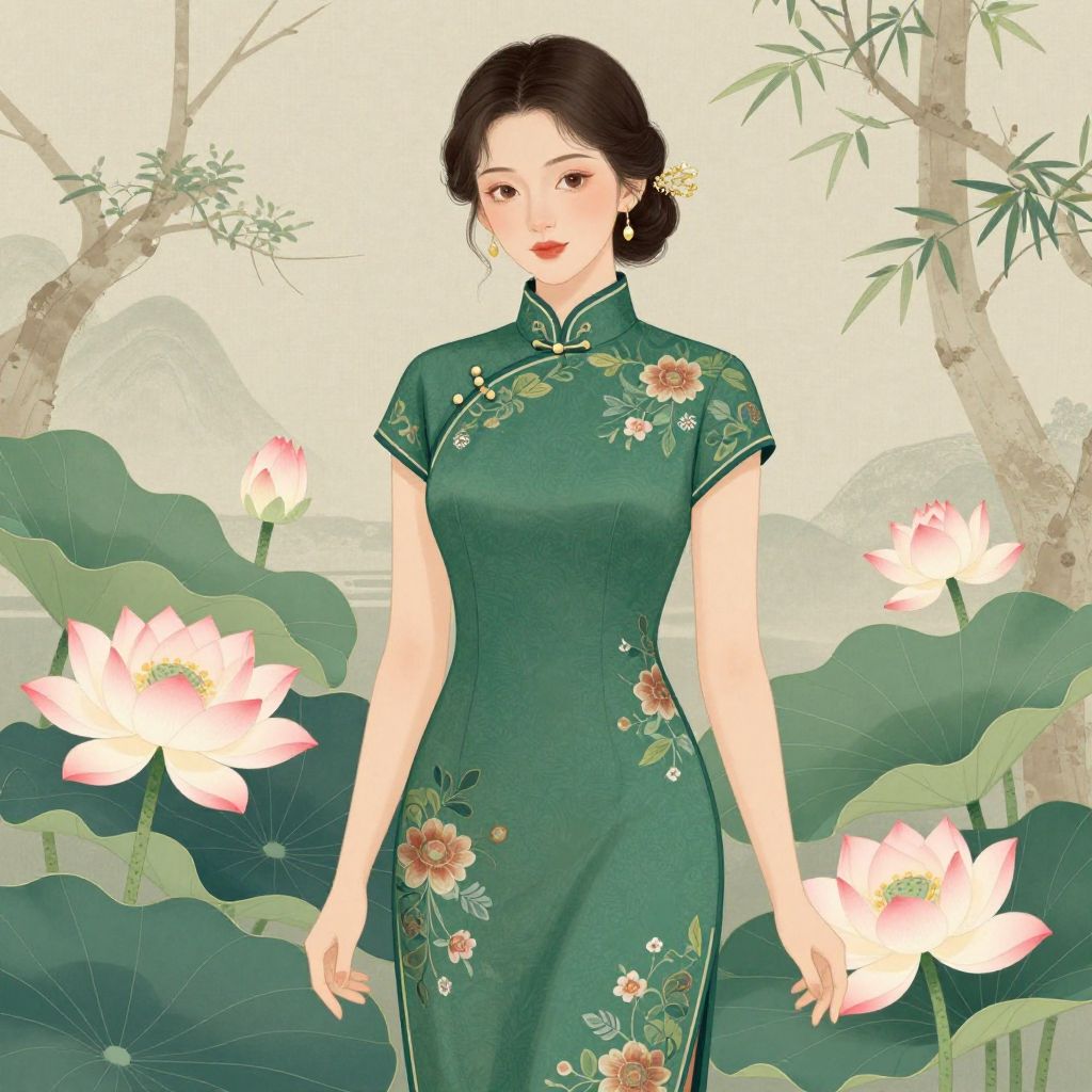 This illustration features a woman adorned in a traditional green cheongsam, characterized by intricate floral designs. The background comprises elegant motifs of lotus flowers and stylized trees, creating a serene and culturally rich ambiance.