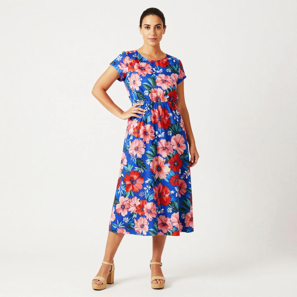 Photograph of a brown-haired woman in a vibrant, short-sleeved, V-neck dress with large purple, yellow, and pink floral prints,