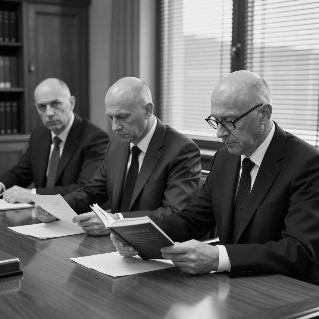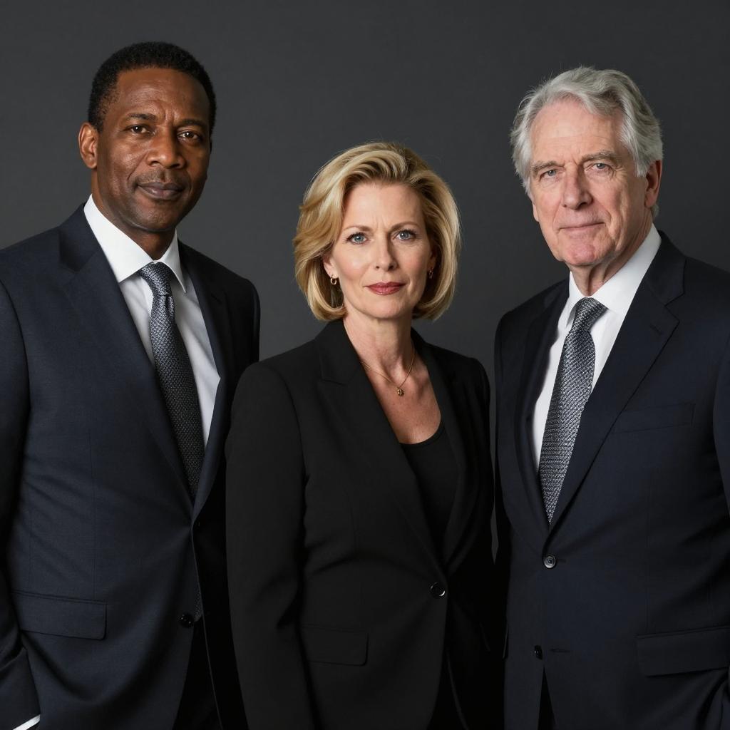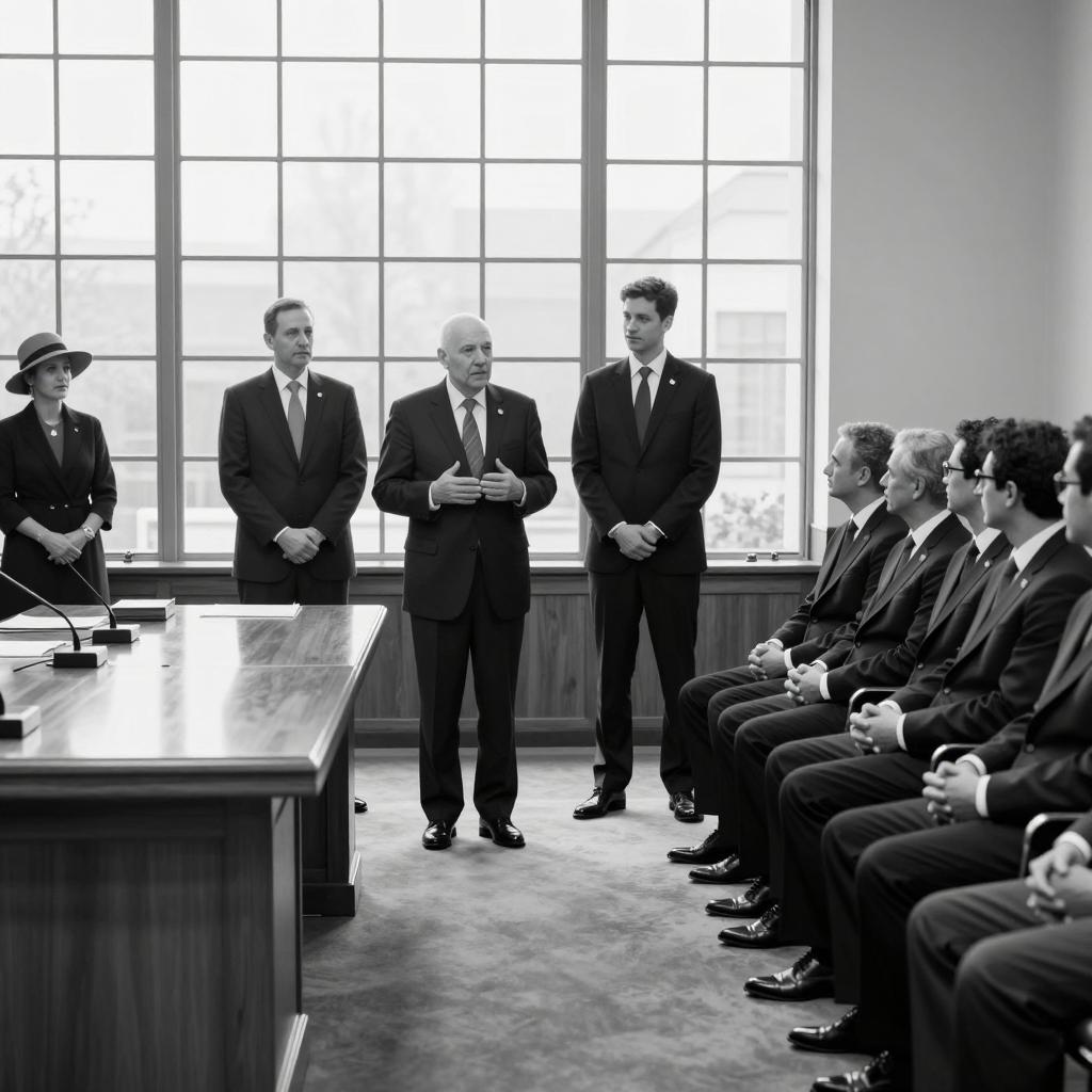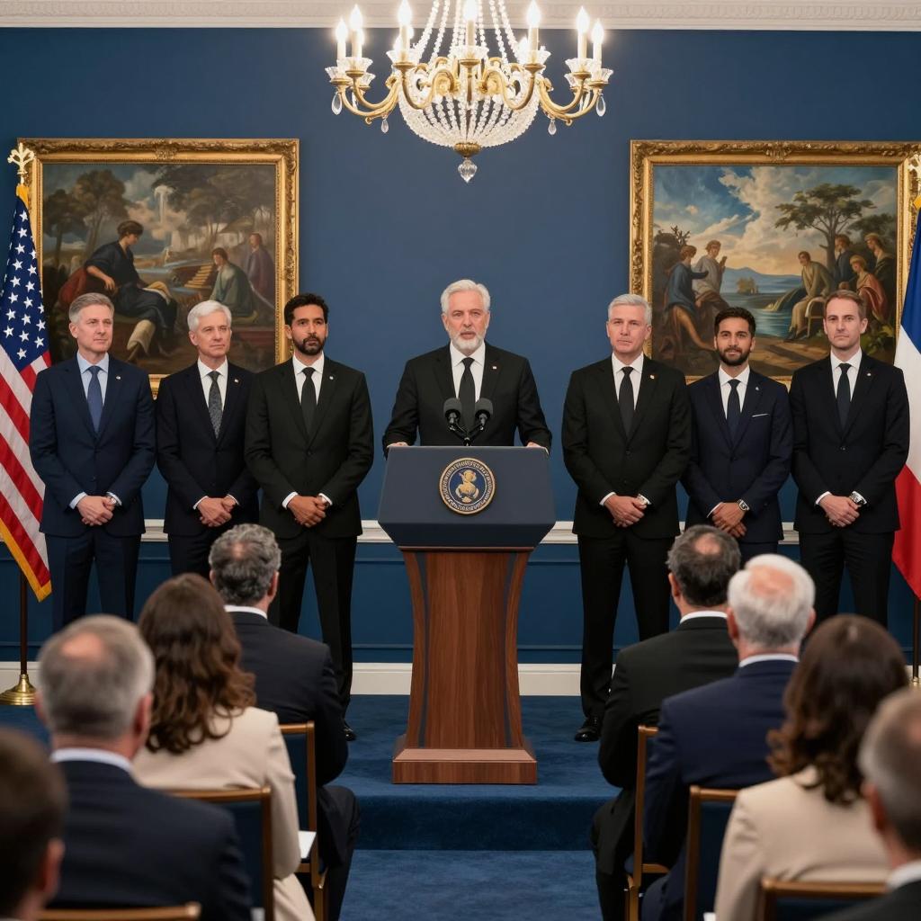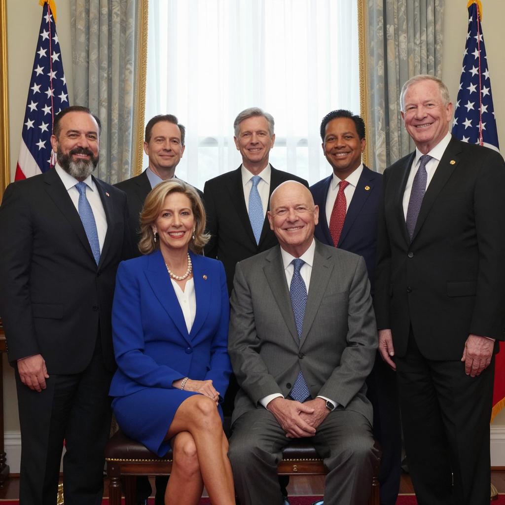 Group photograph of eight people standing and sitting in front of a window with curtains. Seven men and one woman, wearing formal and business attire, in a room with American and state flags. The woman in the center wears a blue suit with a white blouse and pearl necklace, sitting with legs crossed. Bald man in gray suit with tie, sitting center, smiling. Smiling men and women in suits and ties, standing and sitting, behind and beside him. Tall man on the right in black suit with gold buttons, smiling. Bearded man on the left in black suit. Five men with various hair colors and styles. Background includes window with white curtains.