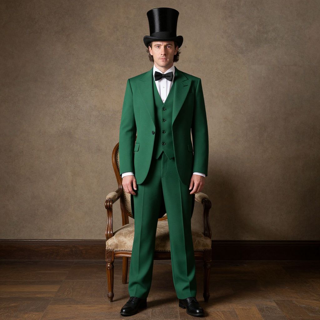 Photograph of a young Caucasian man standing in front of a muted brown textured wall. He has fair skin, short brown hair, and a slight mustache. He is wearing a black top hat, green three-piece suit with a white dress shirt and black bow tie, and black shoes. He stands in front of an ornate wooden armchair with cream-colored upholstery. The floor is wooden with a warm brown tone. The man's posture is straight, and he looks directly at the camera with a neutral expression. The lighting is even, highlighting the formal attire.