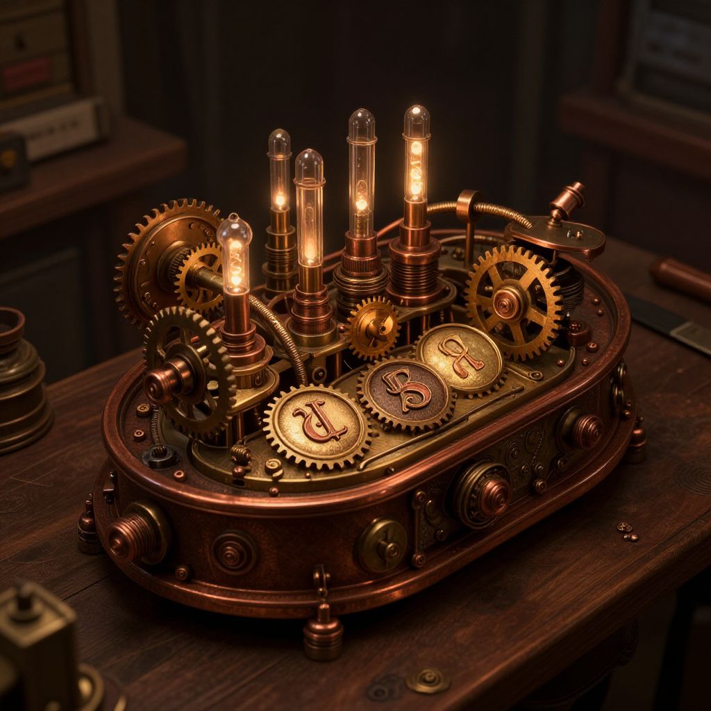 Photograph of a detailed, steampunk-style mechanical device on a dark wooden table. The device features brass gears, cogs, and four glowing filament bulbs. The brass components have intricate detailing, including a dollar sign on two of the gears. The device is oval-shaped with multiple small knobs and a winding mechanism on the right side. The background is dimly lit, with a blurred shelf and objects, emphasizing the warm, amber glow of the bulbs and the metallic sheen of the brass. The overall atmosphere is industrial and vintage, with a focus on craftsmanship and intricate design.