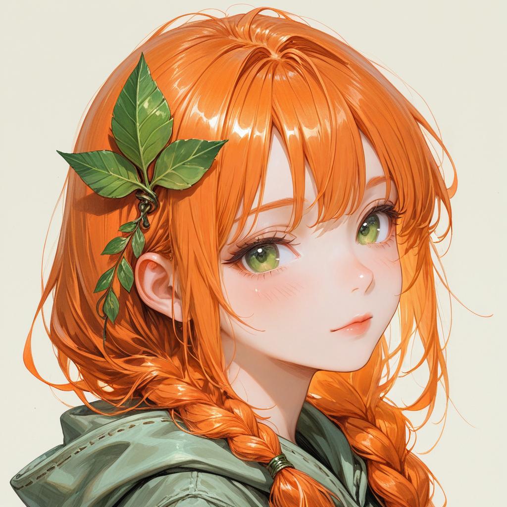 Digital portrait of a young girl with vibrant orange hair styled in a single braid over her shoulder. She has large green eyes, subtle makeup including lipstick and eyelashes, and wears a hooded garment in muted green. A natural green leaf hair ornament decorates her hair. The image features a simple, neutral background emphasizing the subject's serene expression and detailed facial features.