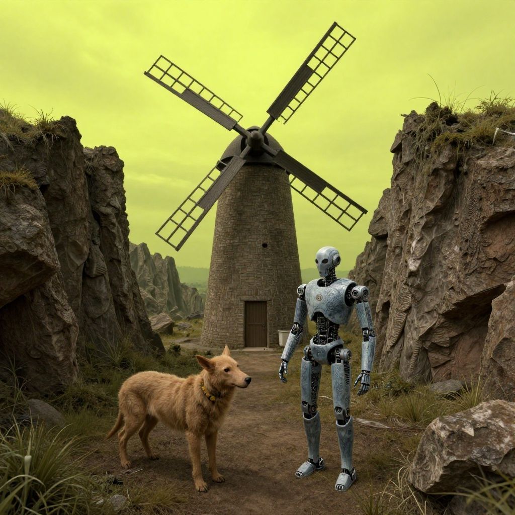 Photorealistic CGI image depicting a metallic humanoid robot standing on a dirt path between two rocky cliffs, with a traditional stone windmill in the background. In the foreground, a fluffy, light brown wolf stands to the left of the robot. The sky is a bright yellow, casting a surreal glow over the scene. The windmill has a dark brown door and large, black, cross-shaped blades. The rocky cliffs are textured with patches of grass. The overall atmosphere is eerie and otherworldly, blending natural and futuristic elements.