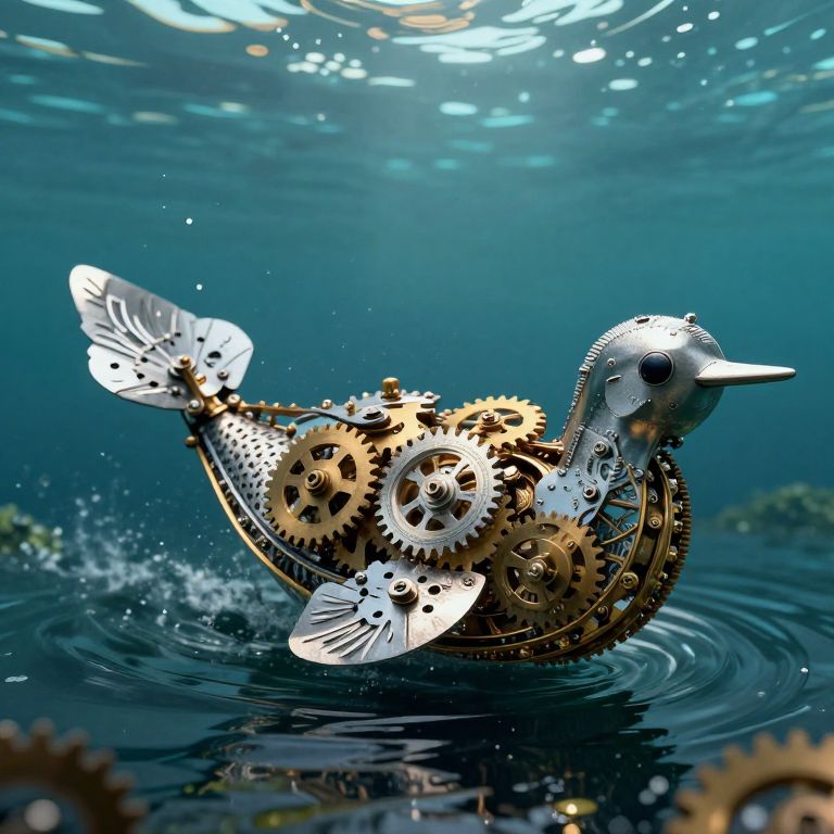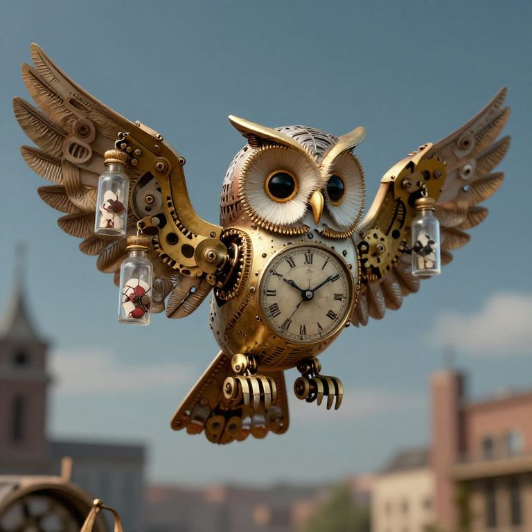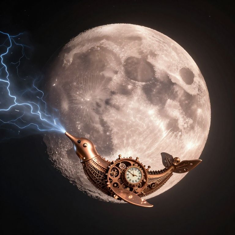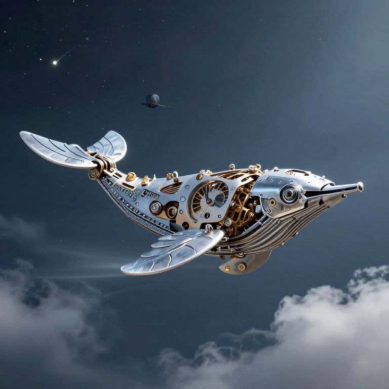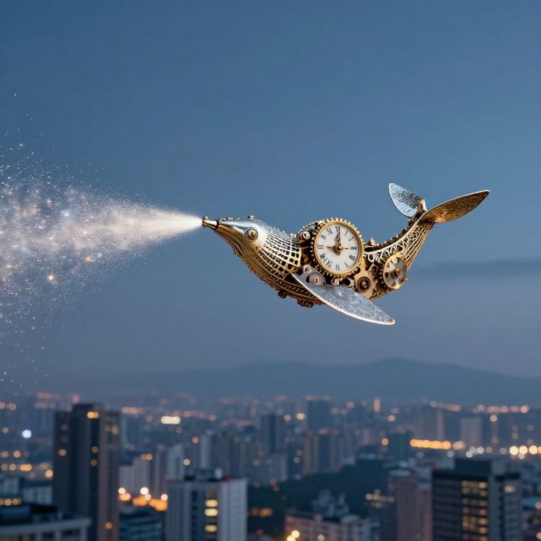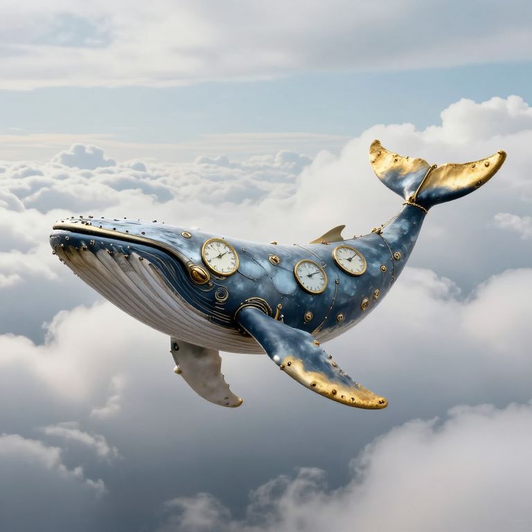 A clockwork whale glides silently through the sky, spouting a jet of stardust above a city where gravity shifts with the seasons.
