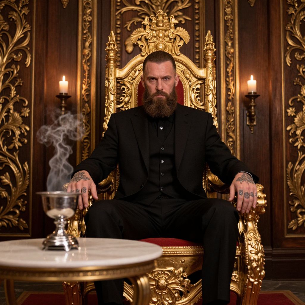 Photograph of a bearded man with a serious expression, sitting on an ornate gold throne. He's wearing a black suit and has intricate tattoos on his fingers. A smoking silver brazier is on a round table to his left, with a richly decorated, dark wooden background featuring gold accents and two lit candles. The lighting is warm, adding a dramatic vibe.
