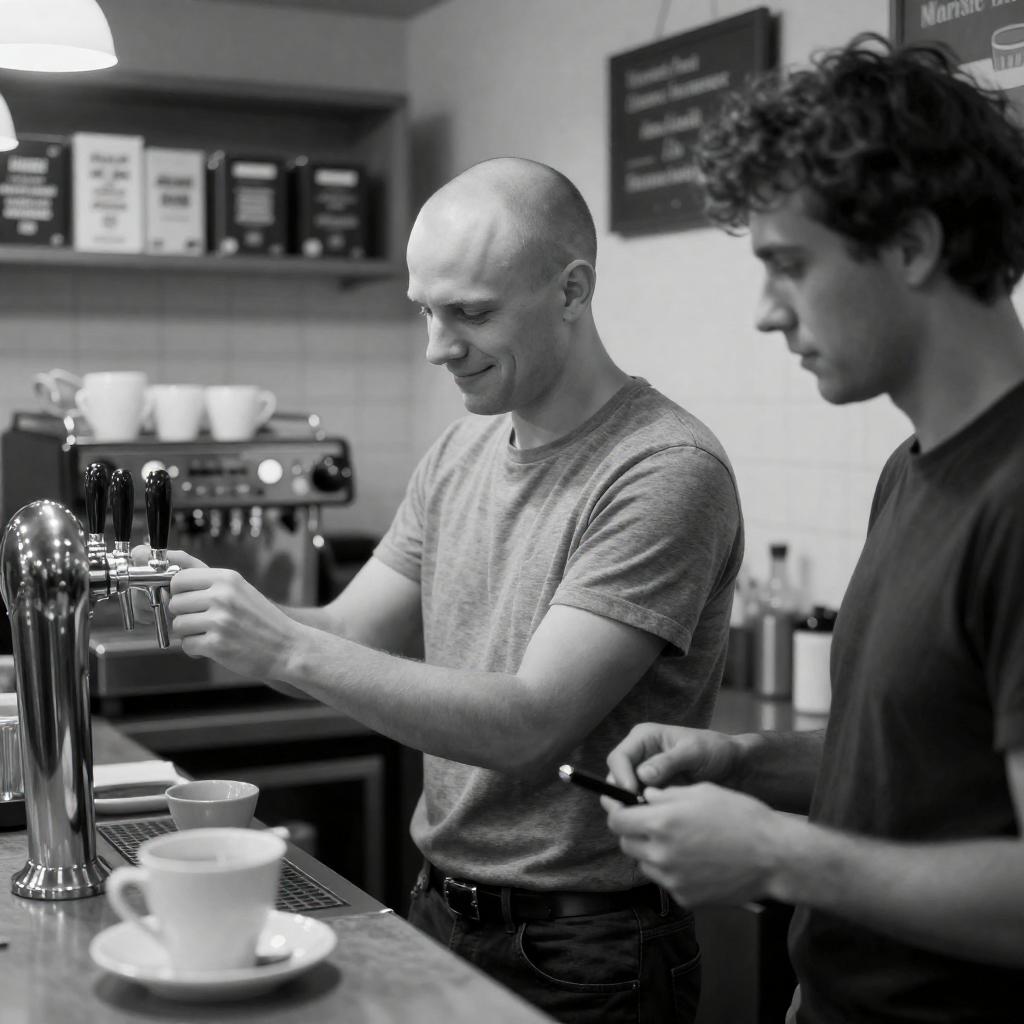 Black-and-white photograph of a café scene. Two men, one bald with a slight smile, one with dark curly hair, stand behind a counter. Bald man operates a beer tap, curly-haired man holds a pen. Espresso machine and shelves with boxes in background. Cups and saucers on counter. Intense, focused expressions on both.