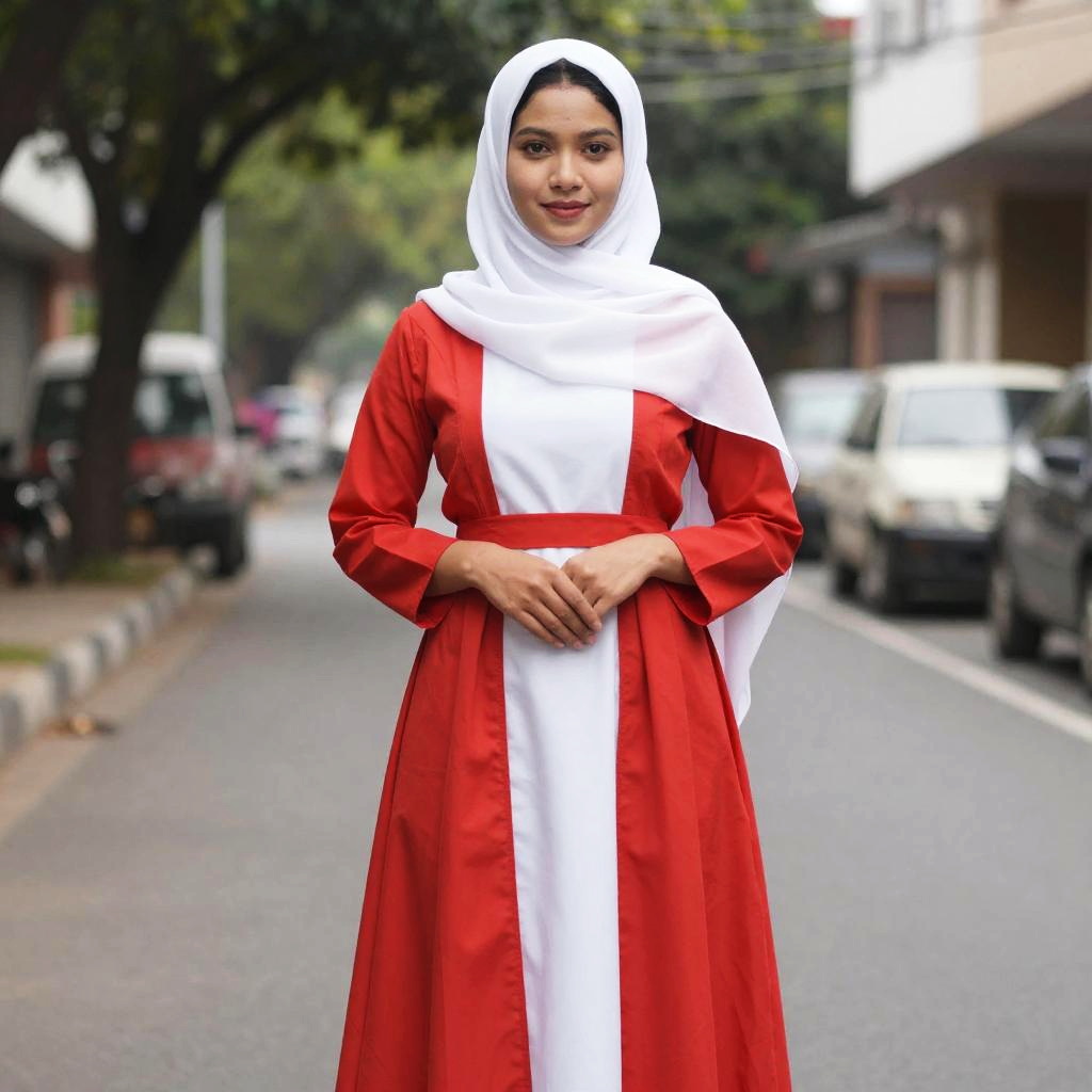 Portrait of a young woman standing on a street wearing a red and white dress paired with a white scarf covering her hair. She has a calm expression and her hands are gently clasped in front of her. The background shows a blurred street scene with parked cars and trees.