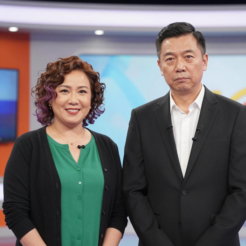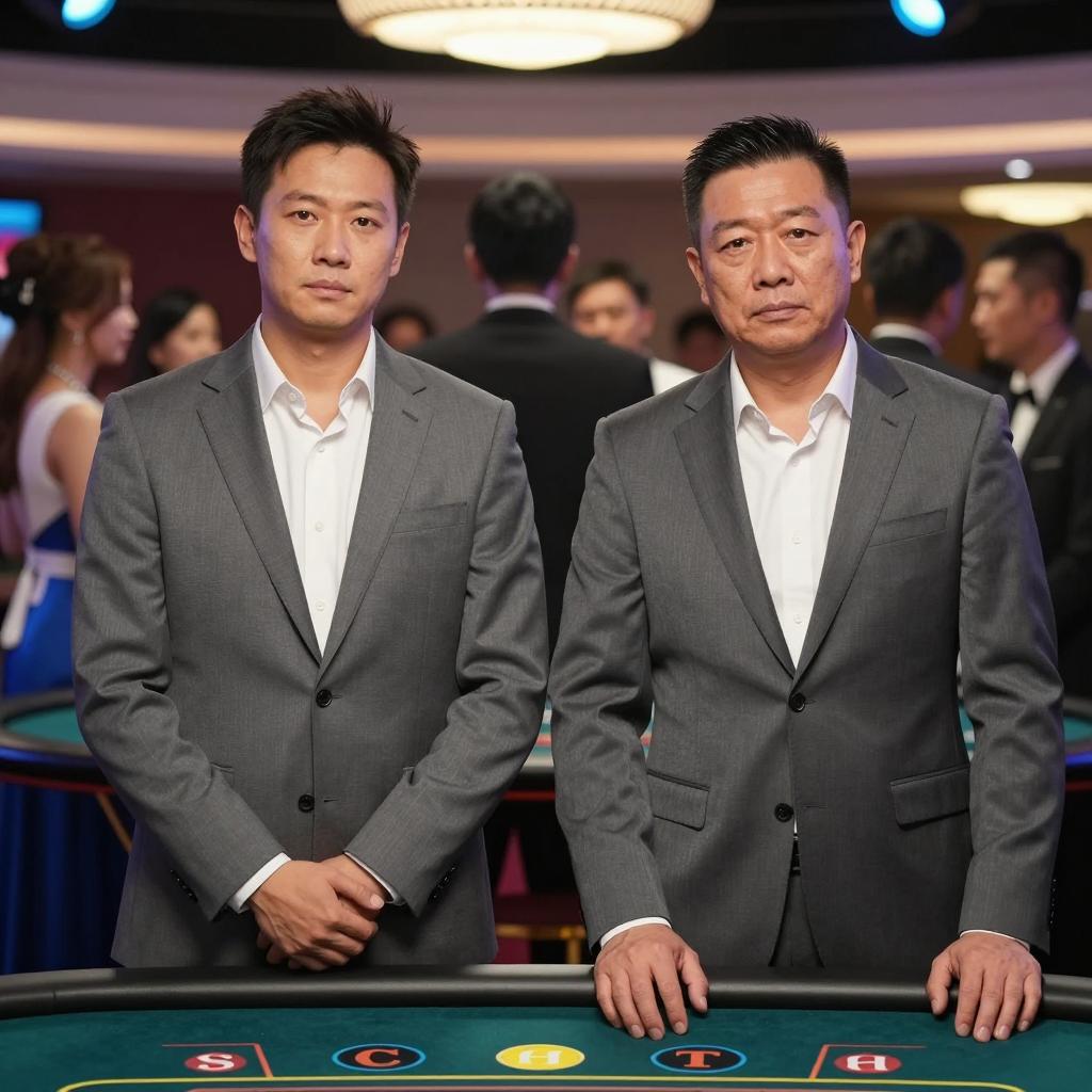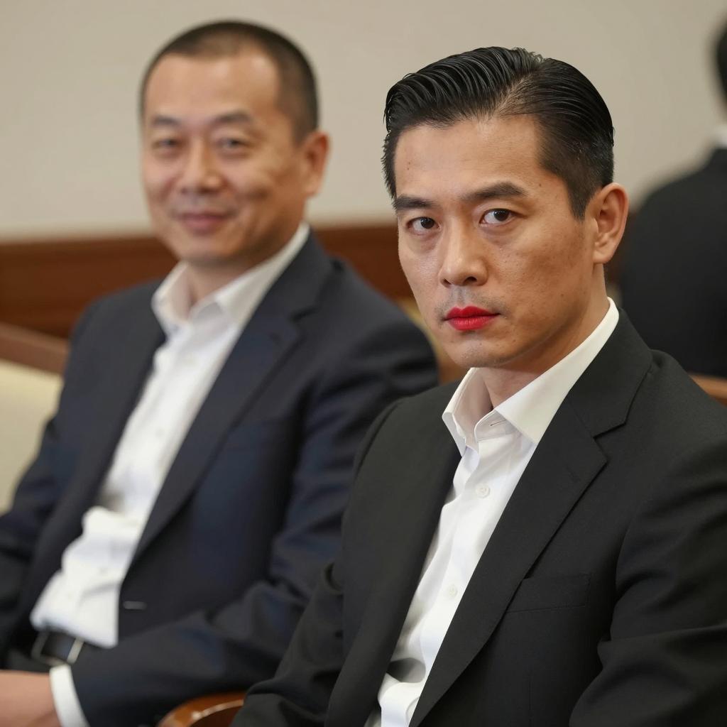 Two men in formal attire sit in beige armchairs, facing each other. One holds a notebook, the other rests his hand on his lap. Between them is a round wooden table with a salad, plates, and a cup. Both wear black shoes and ties, with the man on the left in a white shirt and the man on the right in a black shirt. Background includes vertical blinds and a door with a circular emblem.
