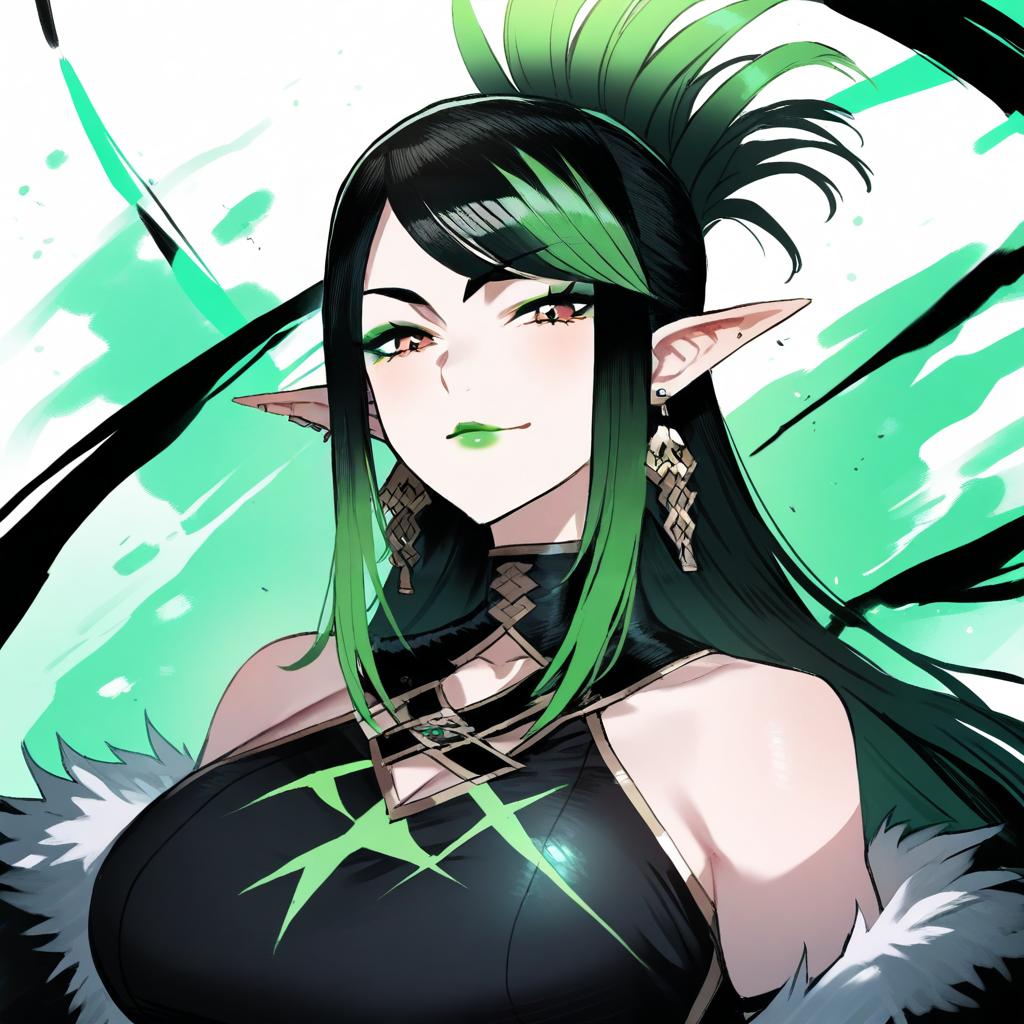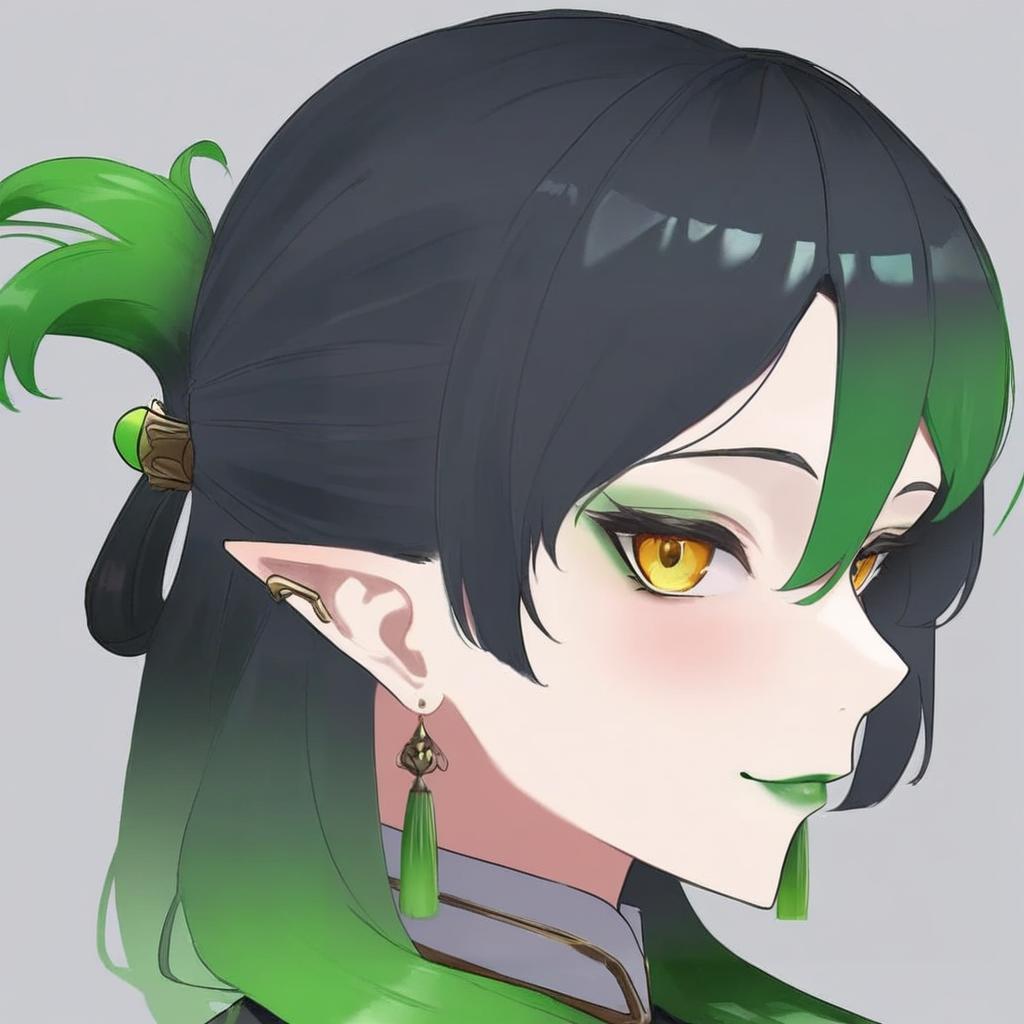 Hanabatake chaika, nijisanji, 1boy, green lips, pointy ears, yellow eyes, green eyeshadow, black hair, green hair, long hair, gradient hair, folded ponytail, virtual youtuber, virtual youtuber, earrings, elf, lipstick, by artist shirow masamune, illustrious