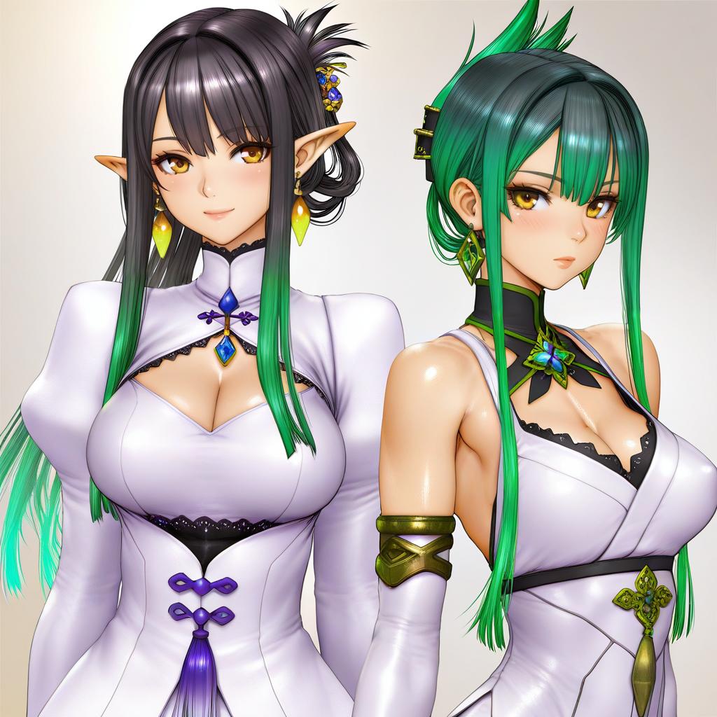 Digital illustration of two anime-style elf characters featuring distinctive yellow eyes, long gradient hair in shades of green and black, and pointed ears. Both characters wear detailed white outfits with ornamental jewelry, including earrings and decorative accessories. The image showcases a polished, high-quality anime art style with fantasy and virtual Youtuber influences.