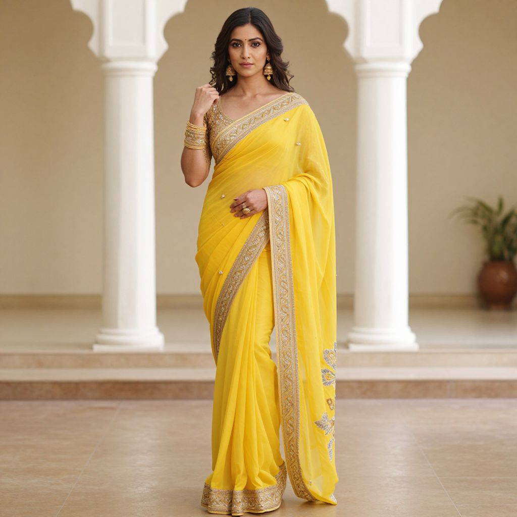 Photograph of an Indian woman with medium brown skin and dark wavy hair, wearing a bright yellow saree with gold borders, standing in a sun
