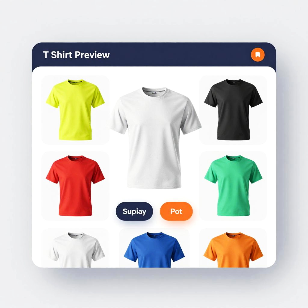 T shirt preview generator interface, sleek modern UI design showing multiple customizable t shirt templates, vibrant color swatches, user-friendly buttons, digital mockup display, clean background, professional graphic design style