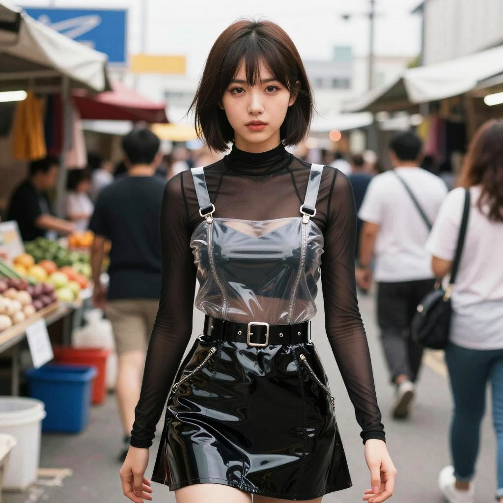 Black hair blue eyes model posing confidently on a futuristic urban rooftop at sunset, wearing sleek avant-garde fashion, vibrant neon lights illuminating her sharp features, a mix of realism and cyberpunk aesthetic in high detail.