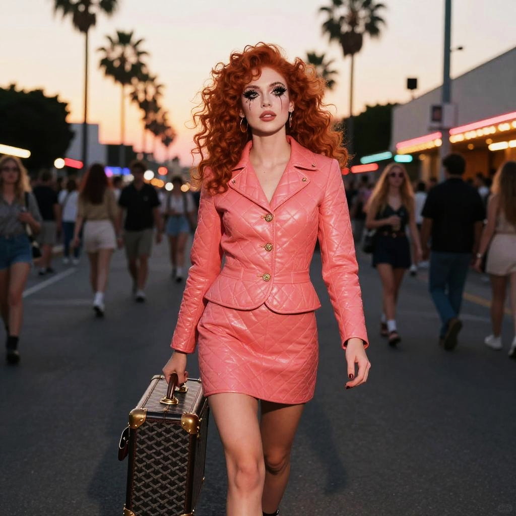 Realistic photo.Octahedron photograph, wide composition 1980s fashion photo, an ethereal fairy with curly red hair, big hair, lots of mascara, cat eye makeup, mascara running, walking confidently wearing a quilted coral pink leather Chanel suit with mini skirt, carrying a black Goyard trunk, boucle tweed, leather, brass, bronze, sparkles on a neon night in Sunset BLVD in Los Angeles. Crowded, party on street, dreamy, romantic, Ultra realistic photo, highly detailed, smooth, sharp focus, love, rock n roll. realistic photo