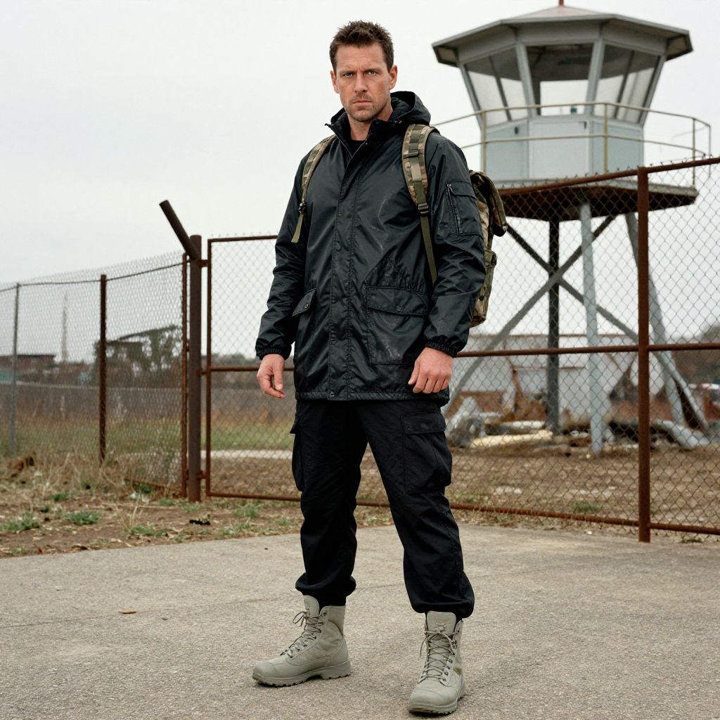 A man, black waterproof parka, fitted cargo pants, lightweight tactical boots, urban camouflage backpack, rusty chain-link fences, guard towers looming, oversaturated film, determined expressionMan has masculine face and piercing eyes