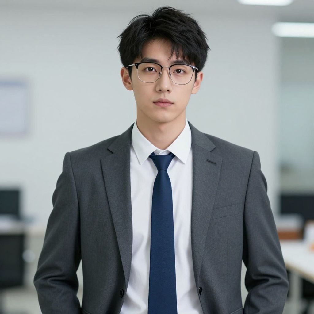 Photograph of an Asian man with short, black, slightly messy hair and fair skin, wearing black-rimmed glasses, a dark gray suit, white dress shirt, and a dark blue tie. He stands in a brightly lit, modern office with a blurred background featuring white walls, a computer monitor, and office furniture. His expression is neutral, and he is centered in the frame, looking directly at the camera. The lighting is even, highlighting his clean, professional appearance.