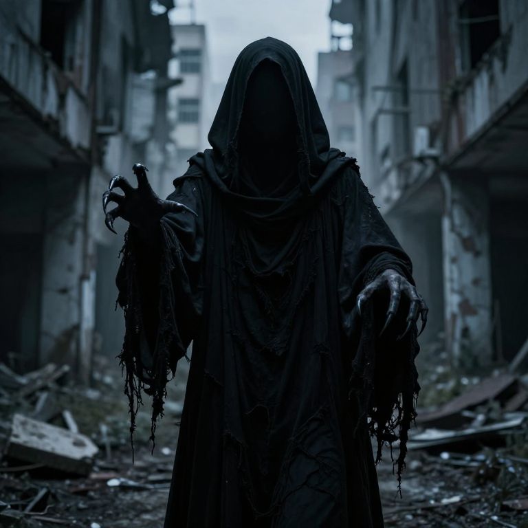 Photograph of a shadowy, hooded figure in tattered, dripping robes, extending claw-like hands in a dark, abandoned, war-torn