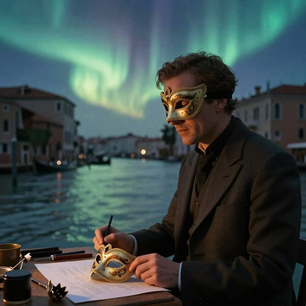 A breathtaking plate photography portrait of a enigmatic Venetian maskmaker, illuminated by soft, enchanting aurora borealis beside a tranquil river. The atmosphere is dreamlike, with a subtle soft focus that enhances the contemporary fashion vibe, reminiscent of Denis Villeneuve and Tim Burton films.