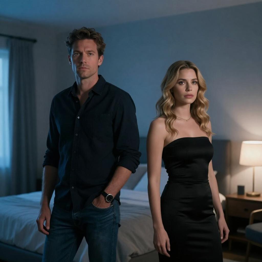 Photograph of a man and a woman standing close. Man has dark hair, stubble, brown suit, intense gaze. Woman has short blonde hair, brown blazer, looks up at him. Background: blurred wooden structure, sunlight filtering through. Man's left side, woman's right side.