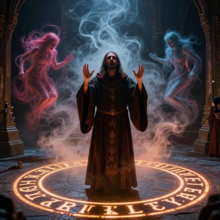 Exorcism ceremony surrounded by ancient runes glowing on stone floors, a robed figure chanting in Latin, swirling mists and spectral forms emerging, intense focus and spiritual struggle portrayed, fantasy horror style with vibrant colors and contrasts.