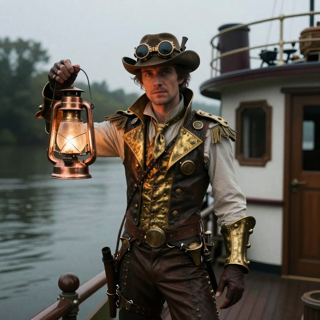 Create a captivating artwork featuring a seasoned maritime architect wearing a brass-buttoned pea coat layered over an oilskin cape with a wool scarf and captain's cap, set against a backdrop of towering glass sails and floating ship hulls connected by rope-and-glass walkways dotted with drifting lanterns and miniature lighthouses in a whimsical architecture scene, all rendered in meticulous detail.