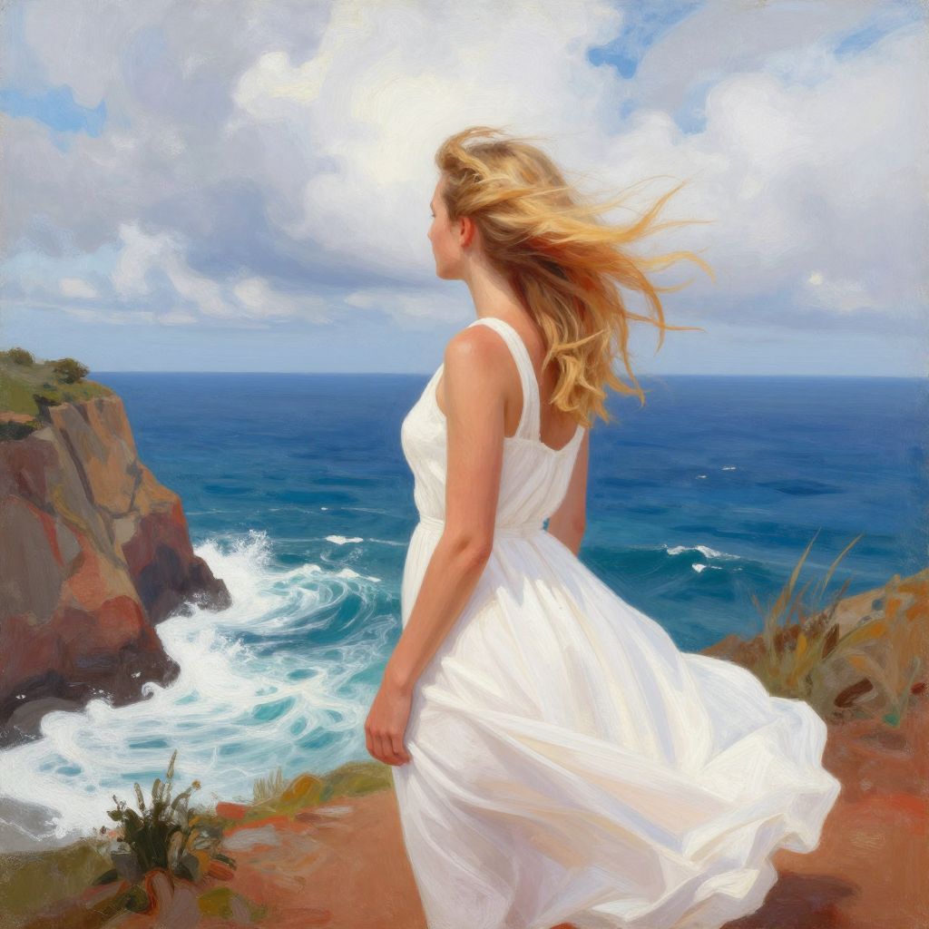 Blonde white women enjoying a summer day at a coastal beach, wearing flowing dresses, the golden sunlight reflecting off the waves, serene and peaceful mood, impressionist painting style.