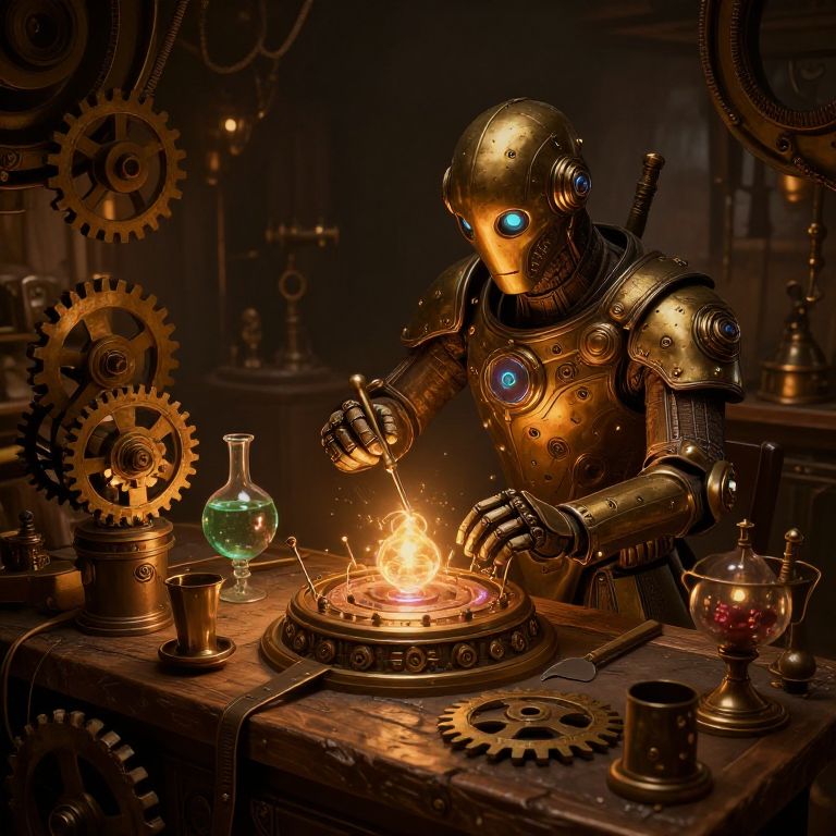 Rpgbot crafting magical gear in a steampunk workshop, surrounded by gears, potions, and enchanted tools, blending fantasy RPG aesthetics with mechanical cyber elements, warm lighting, highly detailed concept art