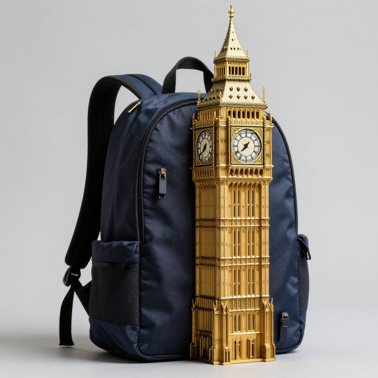 A surreal backpack transforms into a towering, golden replica of Big Ben, defying scale and reality as the iconic clock tower emerges from its fabric in a whimsical fusion of everyday utility and architectural wonder.