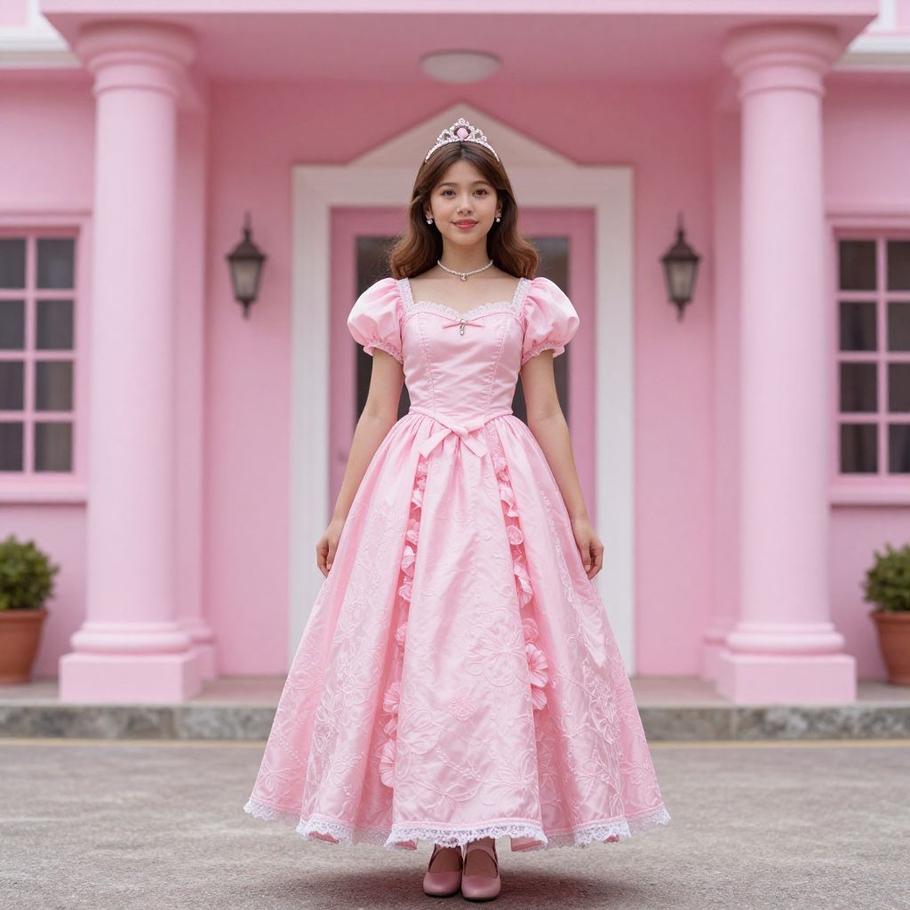 Photograph of a young Asian girl standing in front of a pink, colonial-style house. She wears a pink, satin, princess-style dress with puffed sleeves and a lace-trimmed skirt, accessorized with a silver tiara. Her long, dark brown hair is loose, and she has a delicate necklace. The house has white trim, two lantern-style sconces, and potted plants on either side of the door. She stands on a gray, paved sidewalk, centered in the frame, with a confident, gentle smile. The overall scene is bright and cheerful.