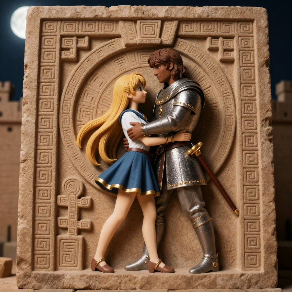 Realistic photo.Aztec-style carving of a brave squire in medieval Europe, embracing in a moonlit ancient fortress, style inspired by Violet Evergarden and Krenz Cushart. realistic photo