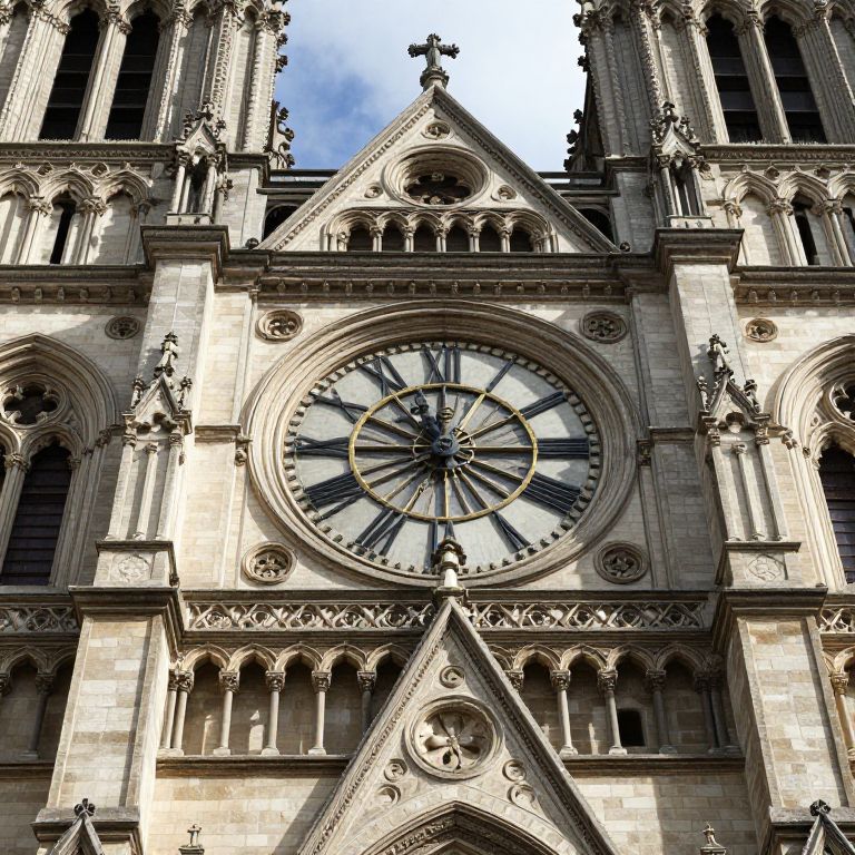 Photograph of a Gothic-style cathedral facade featuring a large, circular clock with black Roman numerals and hands on a white background. The clock is centered between two tall, intricately detailed towers with pointed arches and statues. The stone structure is light beige, with ornate carvings and decorative elements, including a cross above the clock and smaller crosses on the towers. The sky in the background is blue with some white clouds. The image has a slightly high-contrast, vivid color style.