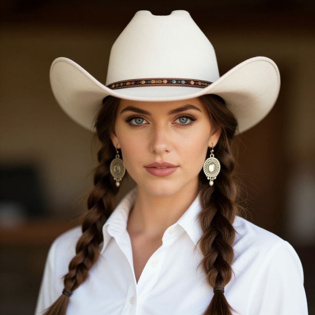 Photograph of a young woman with fair skin and striking blue eyes, wearing a white cowboy hat with a black beaded band, and a white button-down shirt. Her long, dark brown hair is styled in two braids, and she has on ornate, silver drop earrings. The background is blurred, featuring dark, indistinct shapes, possibly indoors. The image has a sharp focus on her face and hat, with a slight vignette effect around the edges. The lighting highlights her clear complexion and the texture of her hat.