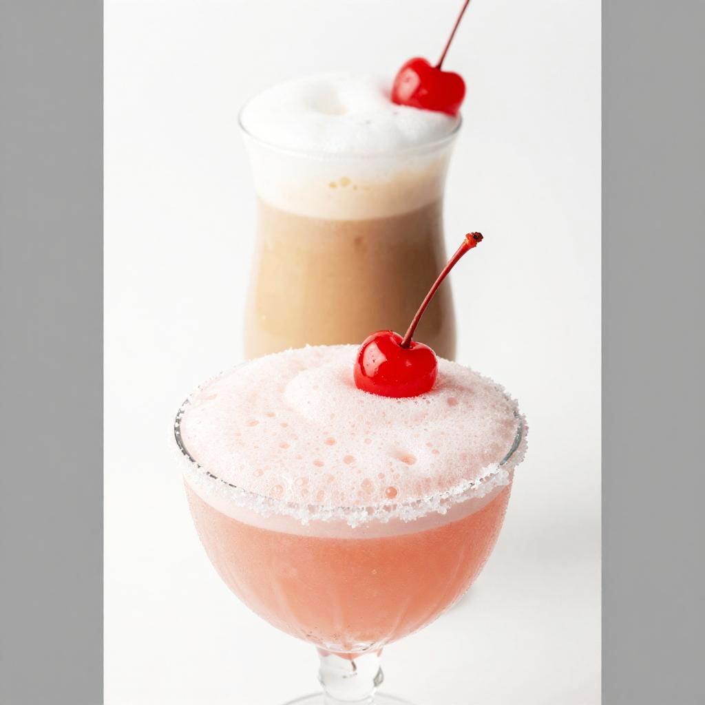 Photograph of a tall, curvy glass filled with a pink, frosty cocktail. The drink is topped with a thick layer of white whipped cream, garnished with a fresh green mint sprig, a bright red cherry with a stem, and a red cocktail cherry stick. The glass is clear and has a reflective surface, standing on a black background that highlights the drink's colors. The lighting is bright and focused, emphasizing the drink's texture and the vibrant garnishes.