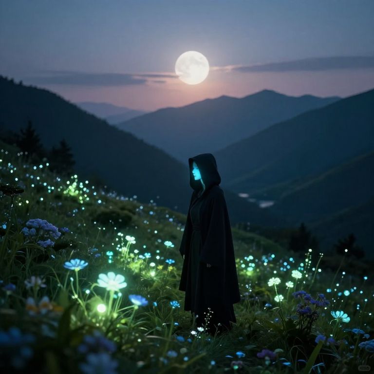 A surreal urban alleyway bathed in neon light weaves through a dense metropolis at midnight, reminiscent of David Lynch's eerie cinematography. A solitary figure clad in a tattered cloak, akin to Edward Hopper's melancholic characters, stands frozen amidst the desolation. The dim glow from an old streetlamp elongates shadows, intensifying tension and evoking feelings of isolation and introspection. This enigmatic character, adorned with intricate tattoos that shimmer like phosphorescent ink, holds a vintage gramophone close to their heart, as if sharing a hushed secret with the vacant surroundings. The haunting melody emanating from this antique device echoes through the empty alleyway, creating an unsettling yet captivating symphony that permeates the charged atmosphere.